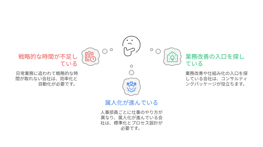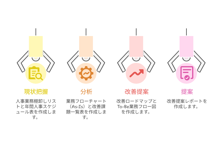 属人化した仕事を整理し、人事部の生産性を上げるための「現状診断+改善設計」プランです。