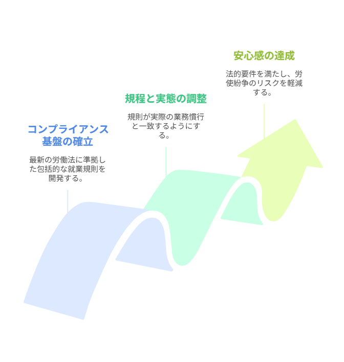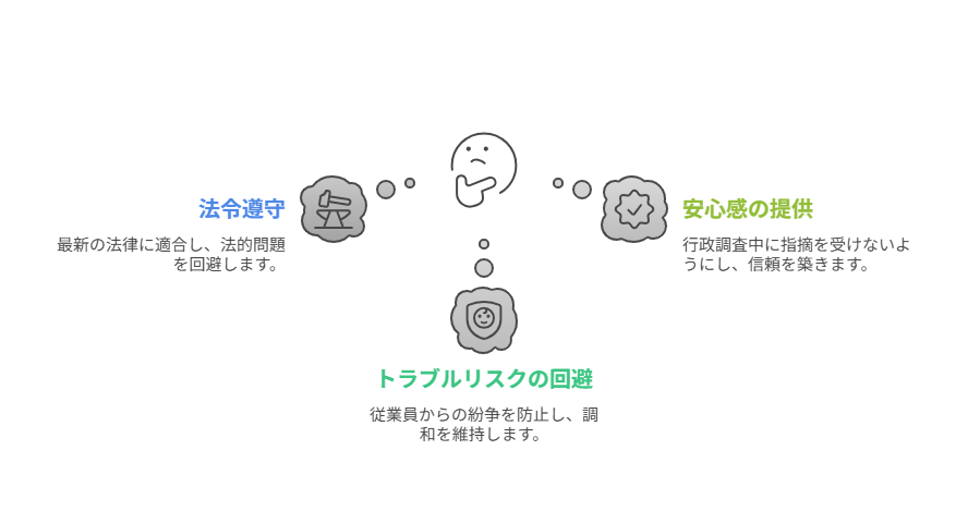 最新の労働基準法、労働契約法、育児介護休業法、パート有期法などに適合させる。 - トラブルリスクの回避
