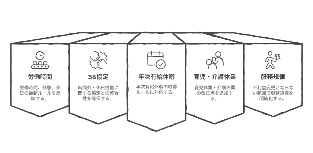 - 必須記載事項(労働時間、賃金、休暇、服務規律など)が網羅されているかをチェック