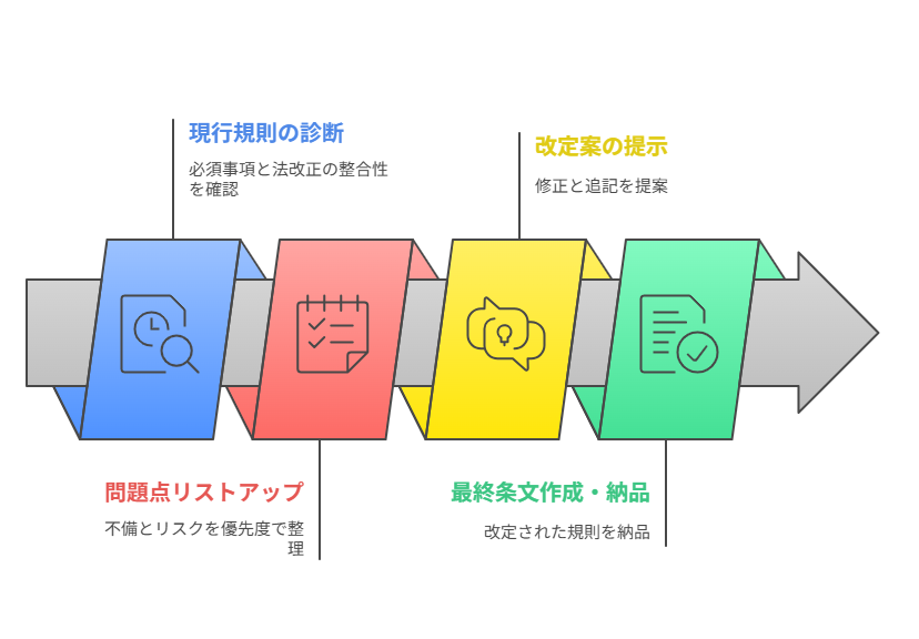 ここから スタンダードプラン(運用トラブルの整理・説明会支援)、プレミアムプラン(経営戦略・人材マネジメントと連動)へと発展させることで、単なる法令対応から「人を活かすルールづくり」へと進化できます。